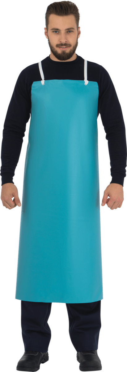 Уплотнённый влагоустойчивый фартук. Стойкий к растворам кислот и щелочей, масел, жирам, спирта, нефти и нефтепродуктам, лакам и краскам на их основе.